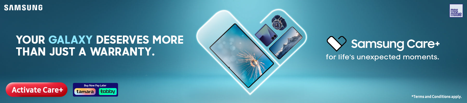You can buy Samsung Care+ with your new Galaxy device by visiting mdsmobile.ae or purchasing from retailers.